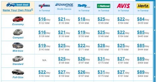 I just got back from a trip where I was debating whether or not to get a rental car. I have a huge preference for Hertz (more on that in a second) but Hertz was astoundingly expensive. How expensive? Check out this comparison chart between Hertz and numerous competitors that I came up for me when I checked prices on priceline.com: